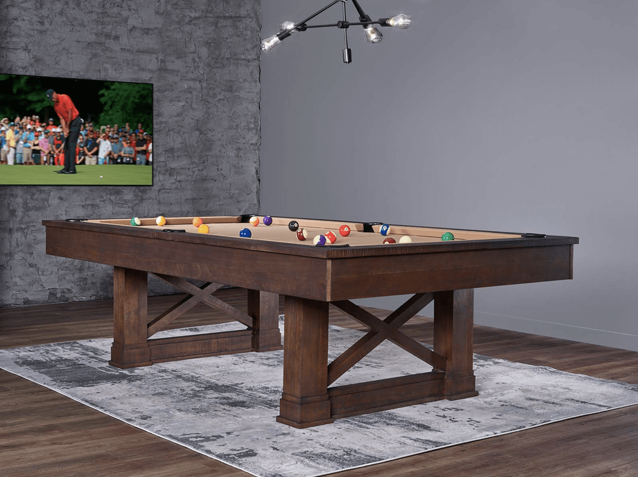 Discover the timeless charm of the Savannah Pool Table. American Heritage has blended classic farmhouse character with refined craftsmanship, it features metal turnbuckles, elemental rings, and recessed black hex bolt sights for a distinctive look. Available in a rich Sable or bold Charcoal finish, the Savannah delivers rustic elegance and professional-grade play with certified slate and K66 cushion construction.$5,045.00 -